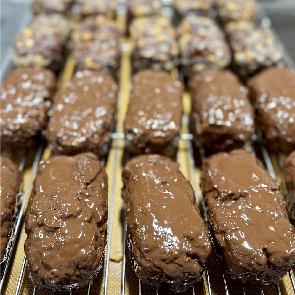 チョコレートたっぷりのざくっとした生地にさらにチョコレートをかけ、粉糖とココアをふるって